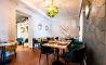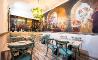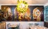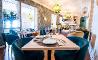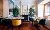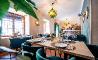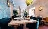 En cuanto al ambiente de este local, también decorado por AM Estudio, está inspirado en la ciudad natal del chef (Venecia), intentando evocar sus colores palaciegos y toques dorados. Las paredes lucen el acabado brutalista del estuco y tienen apliques diseñados a medida. La personalidad y el color cobran protagonismo con el azulejo de la barra que, junto a la vegetación, aportan frescura al restaurante. Sencillez y elegancia en contraposición con un papel pintado que recuerda a los antiguos arlequines venecianos. Destaca el mural del salón privado que evoca un fresco al óleo representando una boda ortodoxa.