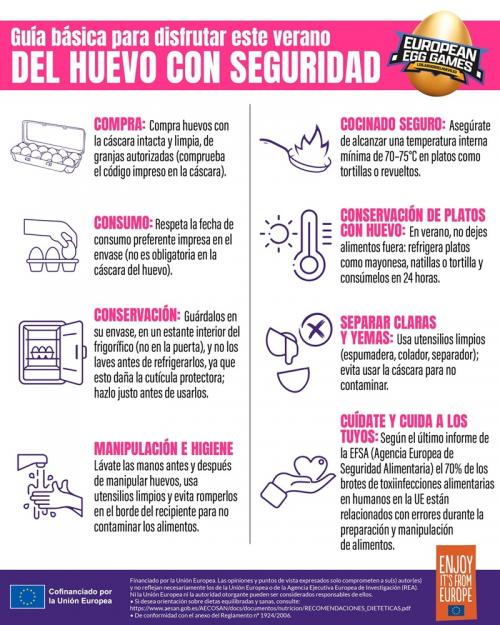 - El Modelo europeo de producción garantiza la seguridad de los huevos que llegan al consumidor gracias a sus estrictos controles desde el origen. - Los consumidores tienen la responsabilidad de conservar y manipular los alimentos de forma segura, especialmente en verano. - En la cocina, mantén una buena higiene en la preparación de alimentos, refrigera los platos elaborados con huevo y utiliza los huevos más frescos para preparaciones sin cocinar.