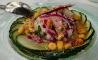 Gazpacho de cerezas con ensalada de mariscos