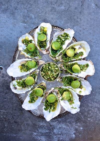 5- Rocíar con un poco de aceite de oliva, adornar con berros y servir las ostras inmediatamente sobre hielo picado, con trozos de limón adicionales al lado.