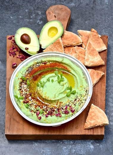 2- Servir el hummus de aguacate en un bol bonito. Utilizar el dorso de una cuchara para hacer unos remolinos en el hummus y decorar con los toppings que se desee. Además, presentar el plato con pitta caliente, naan o crudités.