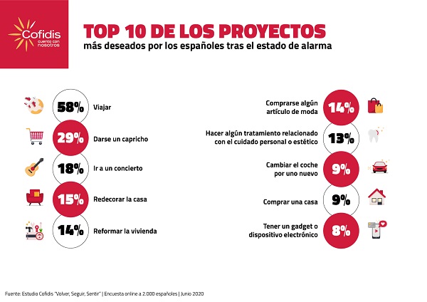 Cofidis, entidad financiera especializada en la concesión de créditos al consumo y proyectos de financiación, ha desarrollado el primer estudio post-confinamiento que valora los proyectos e ilusiones de los españoles en su vuelta a la normalidad tras el Covid-19. Bajo una muestra de 2.000 españoles, el 58% de los encuestados sitúa viajar como el principal plan a cumplir, seguido por darse un capricho (29%) e ir de concierto (18%).