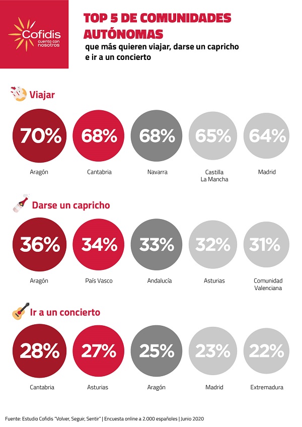 Aragoneses (36%) y vascos (34%) serían los más ‘caprichosos’ tras el fin del confinamiento, mientras que cántabros (28%) y asturianos (27%) son a los que más les gustaría ir a un concierto cuando todo acabe -diez y nueve puntos porcentuales de diferencia, respectivamente-.