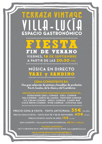 El fin del verano se acerca, y lejos de despedirlo con tristeza, el Espacio Gastronómico de Villa-Lucía ha organizado una estupenda cena-fiesta el viernes a partir de las 20.30 horas en su ‘Terraza Vintage’, una localización llena de sorpresas y elementos originales, que contará con las actuaciones en directo del grupo Taxi y el cantante y showman Sandino. Los asistentes también podrán disfrutar de una gran selección de pintxos y bocaditos a base de productos locales y de ‘kilómetro 0’, combinada con un importante despliegue de cavas y vinos de la zona que se podrán degustar en el marco de los diferentes rincones gastronómicos de la terraza. Además, y de la mano del proyecto ‘Magic Night Tour’, quienes deseen disfrutar cómodamente de esta fiesta, contarán con autobuses con salida desde Oion-Logroño, con paso por varias localidades de la comarca. Y regreso desde Villa-Lucía con diferentes direcciones al