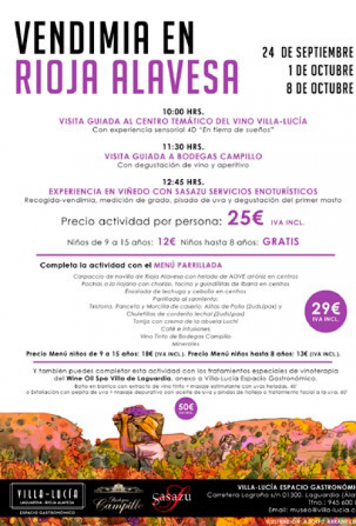 El otoño ha llegado y el campo ya empieza a vaticinar sus nuevos colores y a ofrecer el fruto que tanto se ha cuidado a lo largo del año. Durante los meses de septiembre y octubre, el Centro Temático del Vino Villa-Lucía, Bodegas Campillo y Sasazu Servicios Enoturísticos ofrecen una vivencia única para conocer y comprender la cultura del vino. Los asistentes participarán en el proceso de vendimia, desde la recogida en el viñedo hasta el pisado de la uva y la elaboración del primer mosto. Un Vinfo o duende del vino será su guía en el viaje mágico a Rioja Alavesa, que disfrutarán a través de la experiencia sensorial 4D ‘En tierra de sueños’.