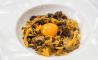 Setas de temporada con butifarra negra de perol y yema de huevo de corral