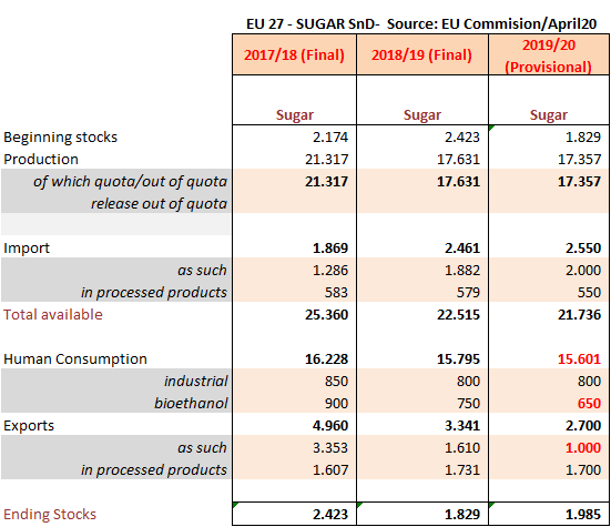 Mientras, en Europa, la campaña 2019/20 finalizará con un stock de azúcar cercano a los dos millones de toneladas, como consecuencia del menor consumo y exportaciones previstas.
