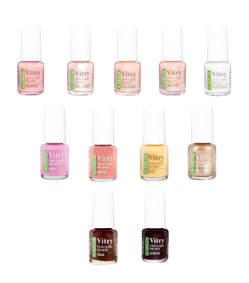 Vitry, firma nº1* de lacas de uñas en Francia en farmacia y parafarmacia (según GERSDATA**), y experta en manicura y pedicura desde 1795, lo sabe, y una vez más sorprende con 11 nuevas tonalidades que se incorporan a la colección más amplia de colorido para las uñas en la farmacia: BE GREEN, compuestas por hasta un 84% de origen natural (ISO 16128), y fabricadas en Francia. Las nuevas tonalidades son: Plume d’ange, Perle Nacrée, Arabesque, Ganache, Folie Étoilée, Gold, Yuzu, Tonka, Lupin y Primerose. Nuevas creaciones que van desde los tonos neutros que evocan elegancia y minimalismo hasta las propuestas más audaces cargadas de brillo, arte y color, con toques brillantes y pasando por tonalidades más profundas.