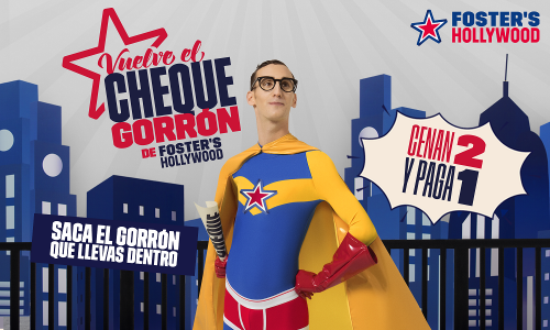 De la mano del superhéroe de todos los gorrones, Foster´s Hollywood te trae la promoción “El Cheque Gorrón”, para que puedas cenar con tus colegas y uno de los dos cene por la cara… o dos de los cuatro, o tres de los seis, aplicándose a tantas promociones como cupones tenga una mesa. Solo se necesita enseñar o descargar el cupón disponible en www.elchequegorron.es y canjearlo en los Foster´s Hollywood adheridos.