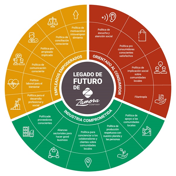 Concretamente, Zamora Company centra su modelo de actuación en 3 ejes: Empleados empoderados, Consumidor y Sociedad, e Industria Comprometida. Unos pilares sobre los que se asientan sus programas de actuación. Programas que van desde la generación de trabajo decente y crecimiento económico, el apoyo a las ciudades y comunidades sostenibles, el empoderamiento del empleado, la apuesta por la producción y el consumo responsable o la reducción de la huella de carbono entre otras. Todas ellas centradas en preservar su Legado de Futuro.