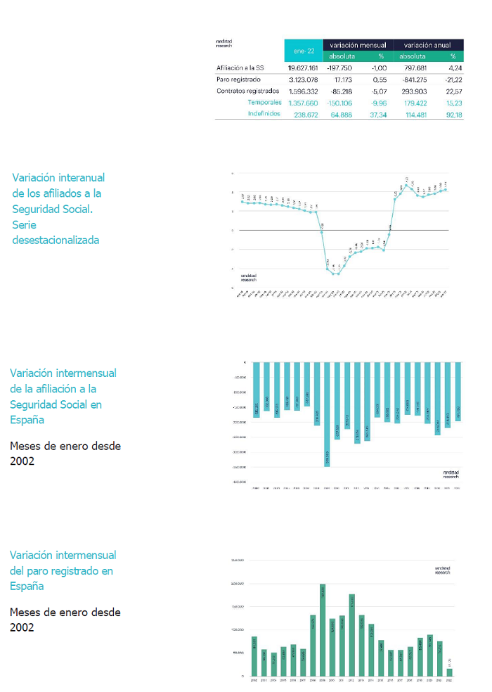 El paro registrado creció en enero en 17.173 personas (+0,55%), el menor aumento del paro en dicho mes de los últimos 25 años. En términos desestacionalizados el comportamiento es positivo, puesto que refleja un gran descenso del paro registrado en el mes. La cifra total de parados registrados queda situada en los 3,12 millones de personas.