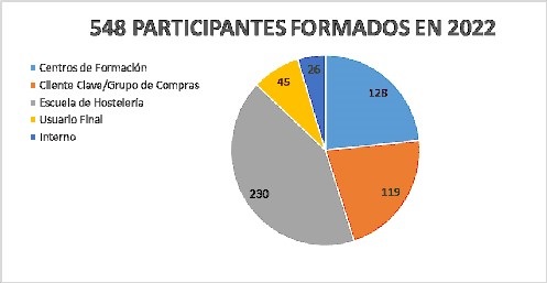 Como otro rasgo característico, esta formación se ha dirigido especialmente al ámbito educativo, con sesiones en los más prestigiosos centros de formación y escuelas de hostelería, para concienciar de la importancia de la seguridad alimentaria a los profesionales desde sus inicios. Así, del total de los participantes, 358, más del 65%, han sido alumnos de restauración. Además, recibieron también formación 119 clientes clave y grupos de compras (21 %).