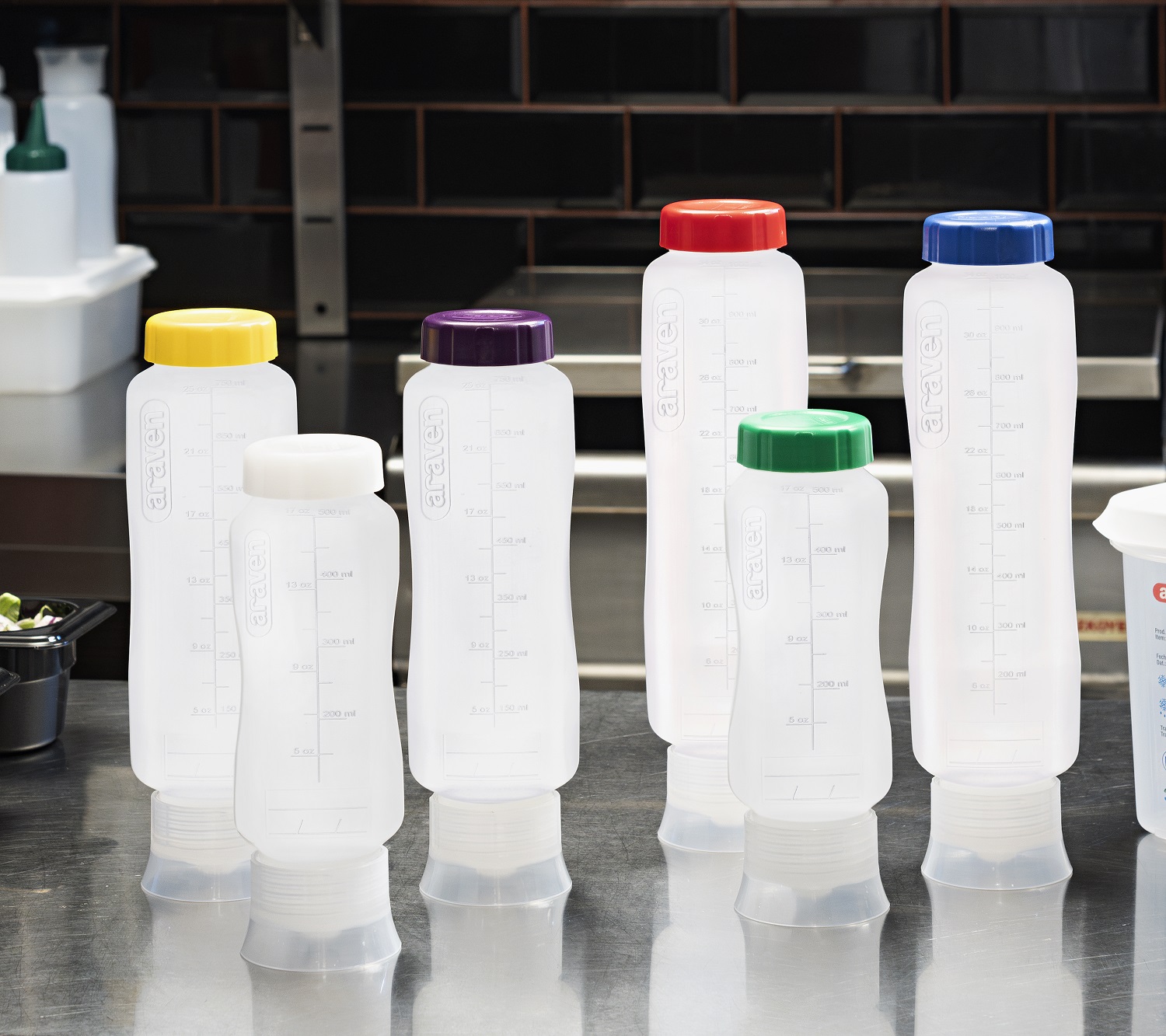 Ahora, el servicio es todavía más fácil y eficiente con los tapones de colores para la identificación de las salsas utilizadas en el servicio. Este complemento se ofrece en bolsas de seis colores surtidos para una diferenciación clara y rápida de las distintas recetas (kétchup, barbacoa, mayonesa, picante, mostaza, yogur o césar, por ejemplo). Además, el propio tapón permite rotular la fecha de elaboración, para una mejor gestión.