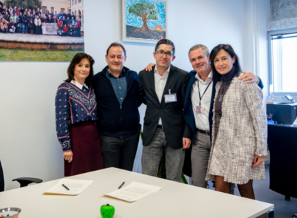 De izda a dcha. Gotzone Heriz (gerente de País Vasco y Navarra), Iñigo Clemente (director de desarrollo empresarial de BBC), Joxe Mari Aizega (director General BBC), Yoseba Jainaga (director General Ausolan) y María López (directora Relaciones Institucionales Ausolan)
