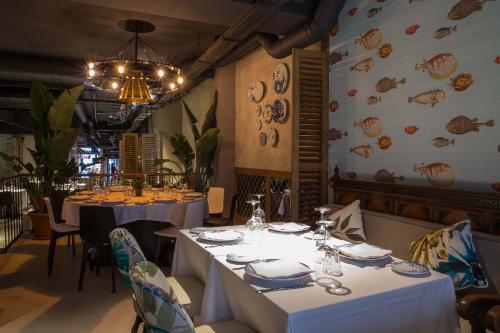 fAmplio restaurante de doble altura con una decoración cuidada hasta el más mínimo detalle, mezclando toques clásicos aprovechando la magnífica arquitectura histórica de los locales del centro de Madrid (cabe destacar su gran bodega de la planta baja) con las últimas tendencias decorativas y arquitectónicas, hacen del restaurante un lugar especial y agradable donde se respira un ambiente único nada más entrar.En la entrada nos encontramos con una gran barra con mesas altas para disfrutar de una comida o picoteo informal, para encontrarnos luego con el amplio salón donde podremos disfrutar del restaurante de una manera más recogida e íntima.