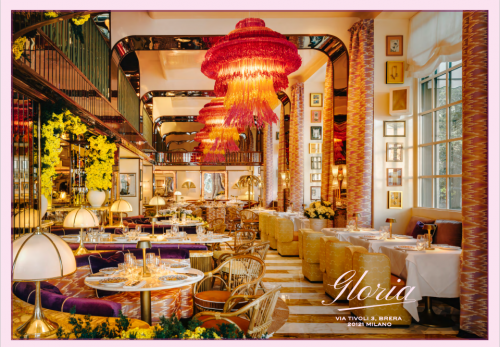 En una de las 226 butacas de terciopelo comienza tu viaje en Gloria, una villa opulenta y glamorosa de mediados de los años sesenta. Desde el suelo de mármol dorado Giallo Siena hasta los enormes y coloridos candelabros de arte de 70 kg hechos a mano por Jacopo Foggini, sumérgete en el mundo de Gloria. Studio Kiki, nuestro brillante equipo de diseño interno, ha reinventado 740m2 como tu fantasía definitiva. No podrías imaginar un lugar mejor para un almuerzo informal o una cena a la luz de la luna con tus queridos amigos o tu próxima cita amorosa. Entra en nuestro entrepiso lleno de detalles personales y maravillosas piezas antiguas. Psst, revísalo dos veces, algunas revistas de marineros de los años sesenta, ilustraciones erótico-románticas en las alfombras y una colección de ropa interior se esconden aquí y allá. Luego, baja al piso principal, para que vivas tu vida como si fuera de oro.