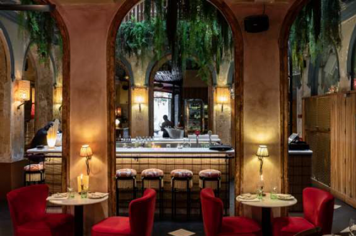 El espacio respira también el ambiente de una casa colonial cubana y los colores cálidos, rojizos y texturas de ratán evocan al Caribe con un toque cosmopolita. Una cocina clásica y abierta, en naranja, contribuye al bullicio de los comensales y deja adivinar las cocciones y los colores de la carta. Arriba, una puerta oculta desvela el mejor bar speakeasy del barrio, donde las horas se alargan sin darse apenas cuenta.