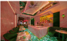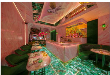 Los elementos del espacio se han elegido al detalle para que todo cobre sentido: Lámparas traídas de París que iluminan el local, un suelo de ágata verde que actúa como alfombra natural del paraíso, mármoles de Oriente Medio que aportan profundidad, piezas escenográficas creadas por artesanos falleros, y mobiliario de terciopelo confeccionado por artesanos andaluces con alma.