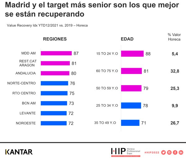 Por regiones, todas las zonas rondaron el 80% de la recuperación en el último trimestre de 2021, finalizando el año con Madrid a la cabeza, con un índice de mejora del 87%, La velocidad de recuperación ha estado íntimamente ligada con las diferentes normativas y restricciones en hostelería.