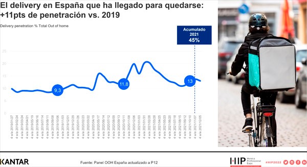 Sin duda, el delivery es uno de los canales que se ha consolidado con la llegada de la pandemia y que permanecerá entre nosotros. Durante el año pasado, aumentó en 11 puntos su penetración con respecto a 2019, llegando a un acumulado del 45% del total de OOH a final de año. De hecho, los canales que más han desarrollado el delivery son los que se han recuperado mejor.