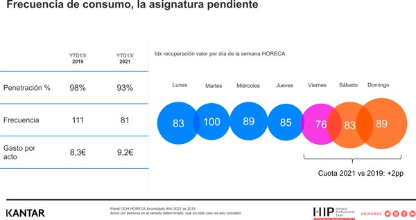 No obstante, a pesar de este buen desempeño del OOH, la frecuencia de consumo sigue siendo la gran asignatura pendiente. El gasto por acto, por el contrario, supera al de hace dos años, al alcanzar los 9,2 euros. Este incremento del ticket se traslada al gasto por persona, que ha aumentado un 11% con respecto a 2019