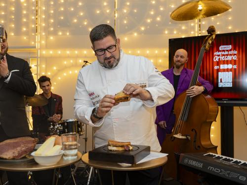 Un bocado de Bimbo® Rebanada Estilo Artesano es una sensación única. Su consistencia permite crear recetas como ésta, que sorprenden por la infinidad de posibilidades entre dos rebanadas. “Igual que un show en directo, no hay dos ideas iguales”, ha afirmado Dani García en BiBo, durante el evento de presentación de este sándwich que ha tenido lugar en BiBo y que ha reunido a artistas diferentes disciplinas para crear un espectáculo sin precedentes que ha unido gastronomía, música y el ambiente más animado.