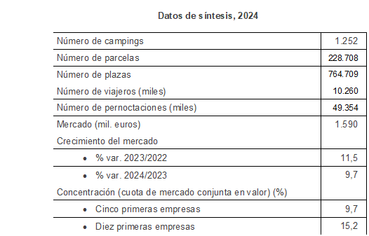 El número de campings operativos se situaba en 1.252 en julio de 2024, lo que representa en torno a un 5% más en 2019, ejercicio previo a la pandemia COVID-19. Por su parte, la capacidad de alojamiento era de unas 765.000 plazas en la temporada alta de 2024, ligeramente por debajo de las plazas contabilizadas un año antes, aunque por encima de las 762.415 de 2019. En cuanto al número de parcelas, se situó en 228.708.