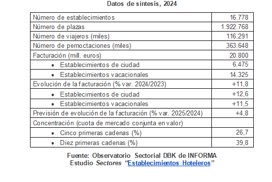 - El negocio hotelero sigue viéndose impulsado por el incremento de la demanda, fundamentalmente de la extranjera, y por el aumento de los precios. Así, tras registrar un crecimiento del 12% en 2024, se prevé que en 2025 alcanzará una tasa de variación del 5%, alcanzando una cifra cercana a los 22.000 millones de euros. - Continúa aumentando la categoría media de los establecimientos, de forma que el cierre de hostales es compensado por la inauguración de nuevos hoteles, fundamentalmente de cuatro y cinco estrellas. - Estas son algunas conclusiones del estudio Sectores “Establecimientos Hoteleros” publicado recientemente por el Observatorio Sectorial DBK de INFORMA.
