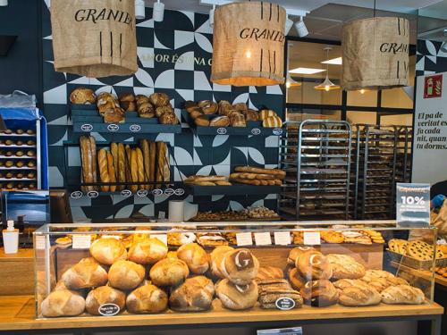Granier sigue apostado por un interiorismo agradable y funcional, de líneas rectas y volúmenes sencillos, pensado para ceder el protagonismo a los expositores de los productos recién horneados, y envolver al consumidor en un mundo de sensaciones. La línea conceptual se basa en la creación de un ambiente moderno, cálido, minimalista y acogedor, que combina los colores negro y blanco, identificativos de la firma, con la calidad del marrón de la madera, los productos expuestos en cestas de mimbre, que le dan un toque tradicional.