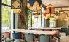 En el centro del espacio una distribución de numerosas mesas altas con inspiración en los tradicionales patios andaluces convive con otras dos zonas de mesas bajas que se asemejan a los salones sevillanos, jugando con papeles pintados y celosías con un toque árabe, diferenciando así los diferentes ambientes y espacios.