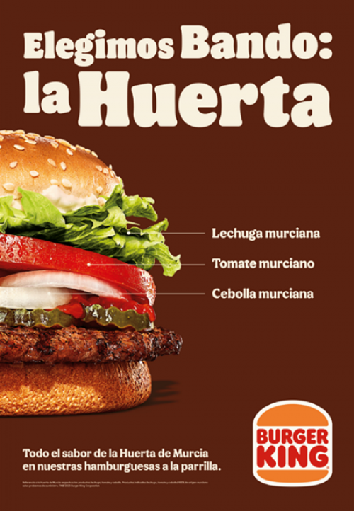 La marca de restauración quiere recordar a sus fans, especialmente a los murcianos, que las cebollas, lechugas y tomates de sus hamburguesas favoritas son de la huerta de su región.Burger King® busca homenajear así a la huerta murciana que tanto sabor aporta a sus hamburguesas con esta activación especial en exteriores (OOH) que tendrá lugar desde el 4 al 17 de abril coincidiendo con una fiesta tan icónica como es el Bando de la Huerta.