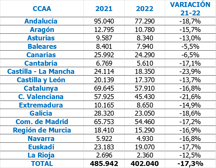 Todas las comunidades autónomas verán reducir su volumen de contrataciones con respecto al pasado año. Baleares (-5,5%), Canarias (-6,5%) y La Rioja (-12,5%) experimentarán las caídas más discretas del país. También por debajo de la media nacional (-17,3%), se encontrarán Asturias (-13%), Castilla y León (-13,7%), Extremadura (-14,9%), Aragón (-15,7%), Navarra, Catalunya (ambas con -16,8%), la Región de Murcia (-16,8%), Cantabria (-17,1%) y la Comunidad de Madrid (-17,3%).