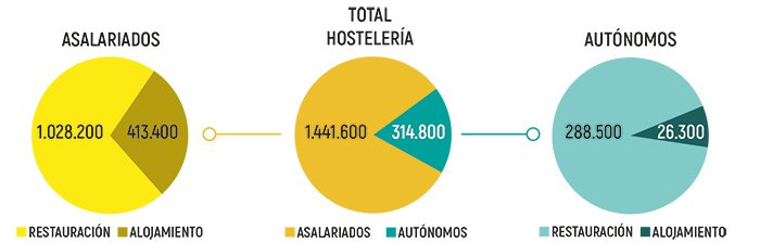 La mayor parte del empleo corresponde al subsector de restauración, que en 2023 representa el 75% del empleo hostelero, con más de 1,3 millones de trabajadores. El 25% restante pertenece a las actividades de alojamiento dónde se superan los 400 mil ocupados. El empleo aumentó en las dos ramas de actividad hostelera con un mayor crecimiento en el subsector de alojamiento, donde subió un 5,8%, mientras que en restauración el alza fue de un 5,3%.