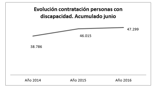 De los datos oficiales se desprende que la iniciada recuperación económica está llegando también a las personas que lo tienen más difícil. En el caso de aquéllas con discapacidad, es significativo cómo han firmado 47.299 contratos entre enero y junio de 2016, un 3% que en el mismo periodo que el año anterior y un 22% más que en 2014, como refleja el siguiente cuadro.