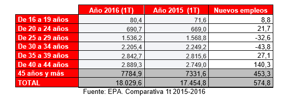 También los mayores de 45 años registran cifras halagüeñas: durante el último año se han creado 453.300 nuevos empleos para ellos, alcanzando la cifra de 7.784.900 ocupados, frente a los 7.331.600 de 2015. De hecho, el 79% de los nuevos empleos generados durante el último año han sido para mayores de 45 años.