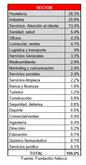 Contemplan el TOP 10 de sectores los oficios (4,3%), el área Comercial/Ventas (4,1%), la Logística y Transporte (4%), los Servicios Generales (3,3%), el Medioambiente (2,9%), el Marketing y la Comunicación (2,4%) y los Servicios Sociales (2,4%).