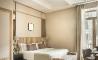 La madera es el material protagonista y es la que consigue, mayoritariamente, ese efecto. De roble, salpicada en junquillos y molduras, juega combinándose con paredes enteladas en lino hasta los altos techos. Cabeceros con molduras de media caña y un completo escritorio creado ‘ad hoc’ son los elementos clave a nivel mobiliario. Frente a las diversas piezas sueltas de antes, ahora se ha aunado todo en pos de la versatilidad, pensando tanto en el ocio como en el negocio que un hotel de estas características implica. Extremos curvos, palillería y espejos de roble envejecido dan textura en esta parte y combinan con las incrustaciones de latón del frente de los armarios, transmitiendo una sensación de orden y serenidad que facilita el descanso tras un largo día explorando los alrededores con las expertas recomendaciones capitalinas del equipo de ‘conciergerie’.