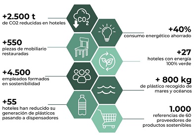 - 2.500 toneladas de emisiones de CO2 reducidas en total en los hoteles mediante medidas de eficiencia energética, como implementación de sistemas BMS –un sistema inteligente que se conecta a equipos de climatización para regular de manera automática los consumos según las necesidades-, monitorización constante para detectar anomalías y actuar de forma rápida, aislamiento de fachadas, integración de fuentes de energías renovables, geotermia, aerotermia… Tanto en pequeños hoteles rurales como en grandes, con más de 300 habitaciones.