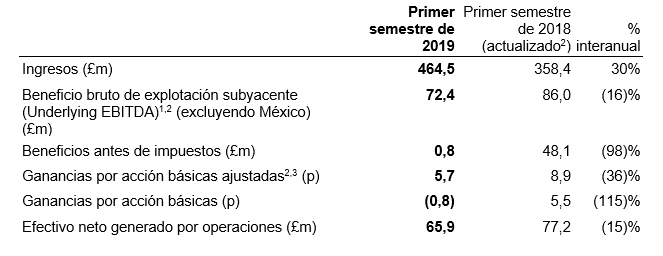 ● El beneficio bruto de explotación subyacente (uEBITDA)1,2 (excluyendo México) se ha reducido un 16% hasta 72,4 millones de libras (79,02 millones de euros aproximadamente), en comparación con lo obtenido durante el primer semestre del 2018: 93,87 millones de euros aproximadamente, lo que refleja la aceleración en la ejecución en los planes de la estrategia de servicios para el reparto