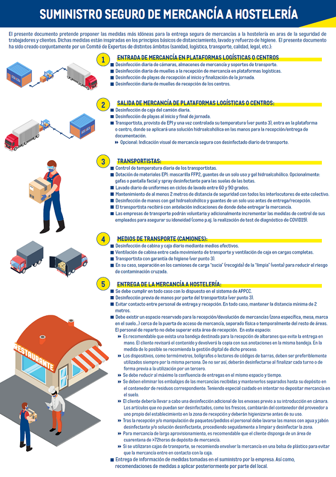 Este protocolo se implementa en la totalidad de la cadena de suministro, es decir, desde la llegada de la mercancía a las plataformas logísticas, hasta su entrega en los establecimientos hosteleros. A grandes rasgos, estas medidas de higiene y seguridad se desglosarían en las siguientes cinco fases: