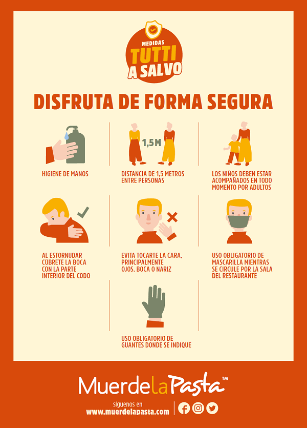 Muerde la Pasta ha estado trabajando a fondo para adaptar su modelo a la nueva realidad. Así la cadena anuncia su vuelta con las máximas garantías de seguridad y calidad. Para ello, ha puesto en marcha todo un Plan de Contingencia Post Covid-19, que incluye medidas higiénico sanitarias adicionales al APPCC del restaurante, tanto organizativas, como de distanciamiento interpersonal, de higiene, manipulación, limpieza y desinfección, para garantizar que todos sus establecimientos son seguros para todos, tanto para empleados como para clientes, y en todas las fases (recepción, almacenamiento, elaboración y servicio).