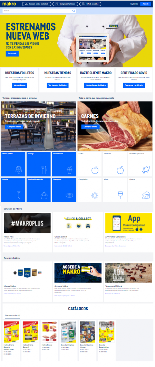 Además, la nueva web de MAKRO presenta un nuevo aspecto visual con grandes mejoras y una estructura más completa, que facilitará el acceso a la información, la experiencia de compra y la navegación para sus clientes. Asimismo, la landing pretende fomentar el uso de otros recursos de la compañía como sesiones y talleres formativos gratuitos para el canal Horeca, o funcionar a modo de canal informativo sobre eventos o encuentros gastronómicos de interés. De tal manera que el hostelero pueda continuar formándose y nutriéndose de contenidos y tendencias del sector, que sirvan de inspiración durante esta difícil etapa.