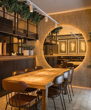 Néstor explica con detalle el cambio de este local que ahora es mucho más acogedor. “El antiguo espacio tenía muchos recovecos y desniveles, por lo que, a través de revestimientos de madera, cerámico -que unifican mucho el espacio-, se le ha dado una calidez necesaria. La barra es ahora un poco más pequeña y comparte el espacio con una gran mesa común ubicada junto a la ventana para aprovechar la luz natural. Además, el salón del fondo se ha dividido en dos zonas, con una decoración diferente en cada una de ellas para que el cliente tenga distintos ambientes. Se ha jugado con maderas, espejos y por supuesto con la iluminación, que siempre es clave. Y como novedad, el local cuenta con una especie de speakeasy muy canalla en la planta baja, ideal para pequeños eventos. Los nuevos baños también merecen una visita…”