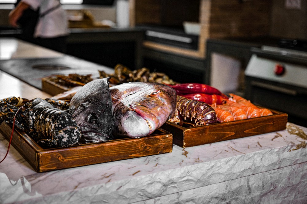 La experiencia comienza con clásicos como la ensaladilla rusa, la empanada de bonito o el pulpo a la gallega, junto a mariscos como la gamba de Huelva, el buey de mar, la nécora o el camarón. Todo ello se puede acompañar con pescados frescos de lonja o carnes como el entrecot o el chuletón de rubia gallega a la brasa.