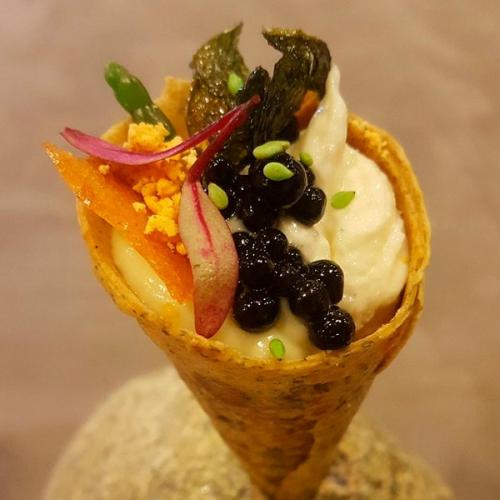 La laboriosa tapa de Paradores es una interpretación contemporánea de la tradicional filloa gallega, concebida en formato mini cono para comerse de dos bocados. Una vistosa versión salada en la que los ingredientes empleados fusionan un amplio muestrario de la rica y diversa despensa del territorio nacional, entre ellos AOVE de diferentes D.O. españolas (Gata-Hurdes, Sierra de Cádiz y Antequera), pimentón de La Vera y de Murcia, ajo negro de Las Pedroñeras, vinagre de Jerez, chocos de Huelva, pataca de Galicia, coliflor de Calahorra, cebollas de Fuentes de Ebro y queso San Simón Da Costa. Una gran cantidad de productos que, unidos a la utilización de técnicas de cocina vanguardistas, aportan la diferencia de texturas y sabores que la hacen tan especial.