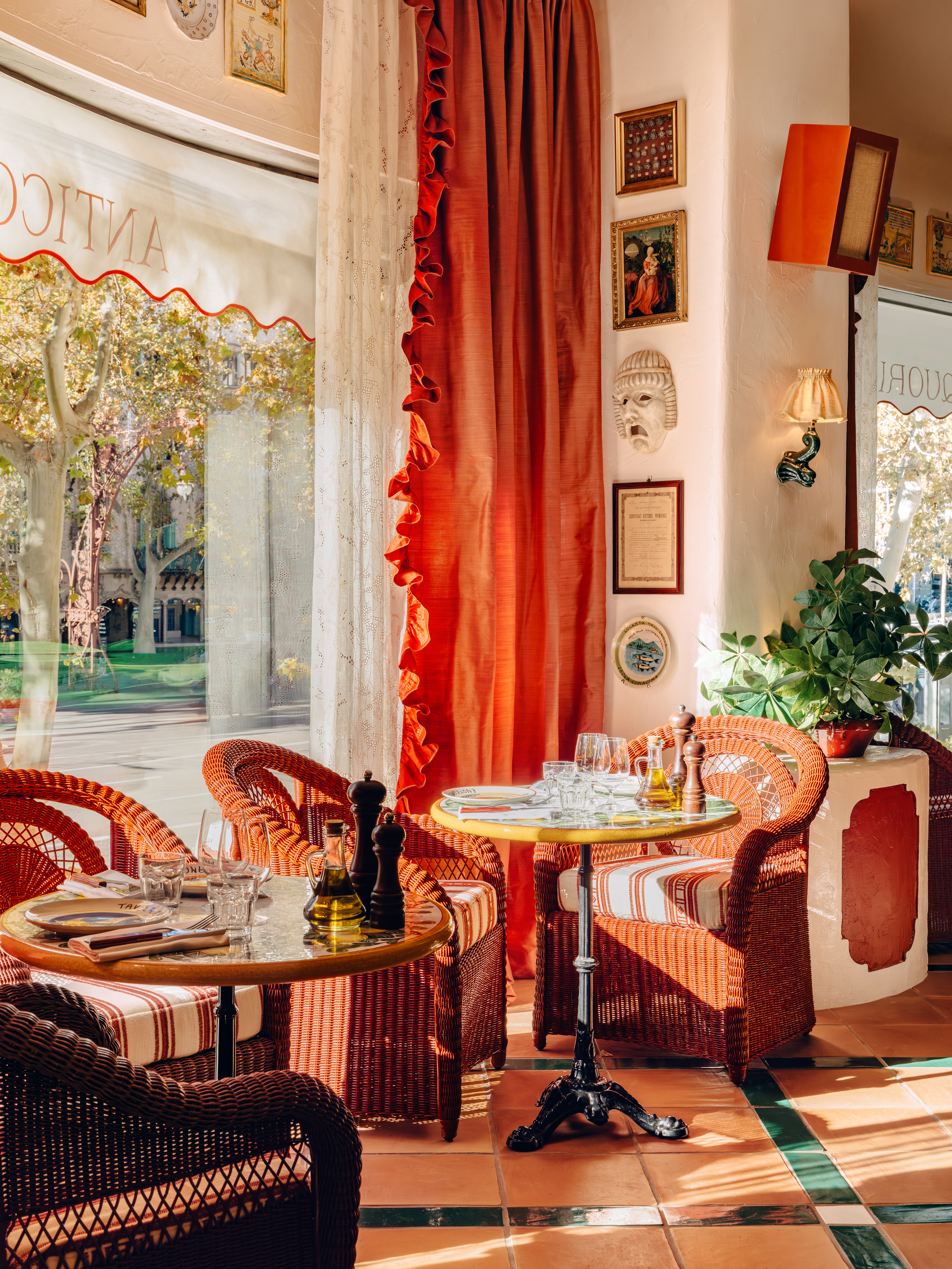 Al cruzar las puertas de Circolo Popolare, diez ventanales monumentales inundan el espacio de luz, conectando la vida del paseo con la energía del restaurante. Algunas mesas incluso disfrutan de balcones con vistas privilegiadas. Dentro, más de 10.000 botellas cubren las paredes, creando un teatro mediterráneo que brilla con cada detalle. Entre guiños religiosos, recuerdos de Maradona, jarrones de cerámica traídos de Italia y un cielo vegetal que da la bienvenida, Circolo Popolare invita a compartir y celebrar.