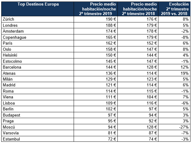 Cada año se observa en el informe que tres de las ciudades más demandadas de Europa para viajes de negocios compiten siempre en cuanto precios más elevados en sus alojamientos. En esta ocasión, Zúrich lidera la lista con una tarifa promedio por noche de hospedaje de 190 € y un aumento del 8% con respecto al segundo trimestre del año anterior. Le sigue de cerca Londres, con un precio por noche de 188 € (5%); y Ámsterdam ocupa la tercera posición, con 174 € (-2%).