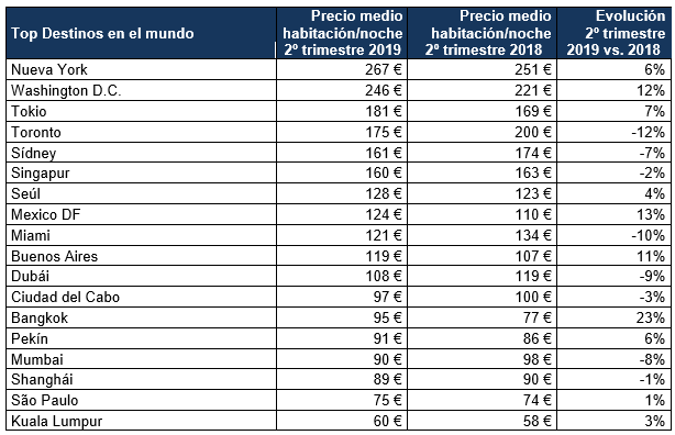 A nivel mundial, las dos ciudades con los precios hoteleros más elevados, según los datos de HRS, se localizan en Estados Unidos: son Nueva York, con un promedio por noche de 267 € y una subida de precio del 6%; y Washington DC, con 246 € por pernoctación y una variación del 12% en el gasto. El tercer puesto lo ocupa Tokio, donde los huéspedes han invertido 181 € por noche y el precio ha evolucionado positivamente en un 7%.