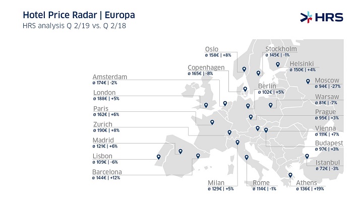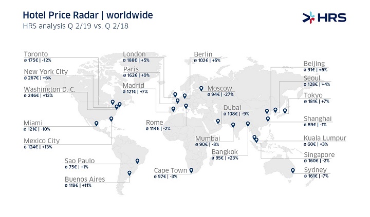 Sobre la evaluación: el informe se basa en todas las reservas de hotel realizadas a través del portal HRS durante el período del 1 de abril al 30 de junio de 2019, que no fueron canceladas y las correspondientes al mismo periodo del año anterior. La encuesta ha tenido en consideración tanto las habitaciones individuales y dobles, con y sin desayuno, en los hoteles de las categorías de una a cinco estrellas. Se evaluaron los destinos con un alto volumen de reservas.