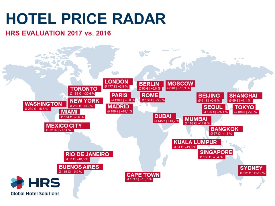 El estudio de HRS también analiza la situación de los precios hoteleros a nivel mundial. Los precios hoteleros han aumentado en Toronto, con el 30,6%; México D.F, 17,4% y Ciudad del Cabo, con el 12,7%. Sin embargo, también hay ciudades que han visto decrecer sus precios como Seúl, con una caída del 25,1%; Kuala Lumpur, con un descenso del -20,3%- ; Río de Janeiro (-19,8%); Singapur, con el -6,4%; Tokio, -5,8%, y Miami, -0,6%.